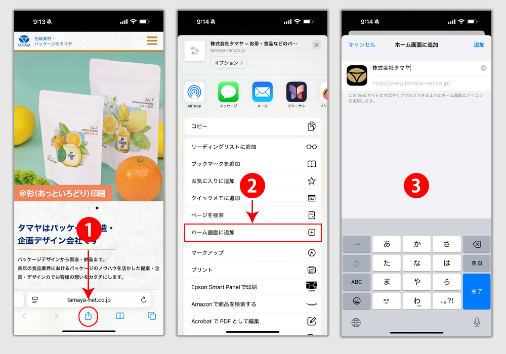 ①ブラウザのツールバーにある「共有アイコン」をタップ